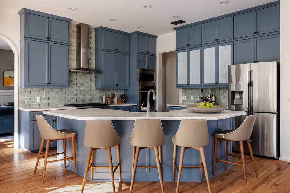 The heart of the home is the gourmet eat-in kitchen, a culinary dream featuring striking blue custom cabinetry, quartz countertops, and stylish tile backsplashes. Equipped with high-end stainless-steel appliances, including a Viking gas cooktop, this kitchen caters to both the aspiring and seasoned chef. Casual dining can be enjoyed in the cozy breakfast nook or at the grand island with a classic farm sink. The adjacent family room, with its stone fireplace, custom built-ins, and Dolby 5.1 wiring, serves as a perfect setting for relaxation and entertainment.